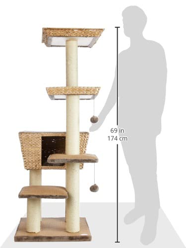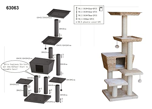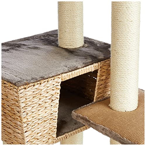 Der Kratzbaum Motega steht auf einer Grundfläche von 48 x 48 cm und ist 141 cm hoch. Das verarbeitete Material ist Wasserhyazinthe und die Sisalstämme haben einen Durchmeser von 9 cm. Er überzeugt außerdem mit verschiedenen Platten.