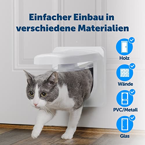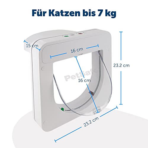 Hochmoderne Katzenklappe aus UV resistenem Kunststoff mit Chip-Lesegerät – lässt nur eigene Katzen passieren Ihre Katze benötigt KEIN gefährliches Halsband. Ein Tierchip – ein etwa reiskorngroßes Glasröhrchen mit einem Micorchip, der eine eindeutige Identifizierungsnummer enthält erkennt Ihre Katze. Diese Nummer wird bei Anmeldung bei Tasso hinterlegt, zusammen mit dem Names des Tieres und Ihrer Anschrift. So kann mit einem geeignetem Lesegerät der Eigentümer festgestellt werden.Ihre Katze wird sehr früh von der Klappe entdeckt. noch bevor sie die Klappe erreicht – und so kann sie schnell das Haus betreten.Einstellungen der Klappe:alle Katzen (mit und ohne Chip) können rein und rausalle Katzen können rein, keine Katze darf rausnur die eigene Katze (eingrogrammierte) Katze kann rein, alle Katzen können rausnur die eigene Katze (einprogrammierte) Katze kann rein, keiner kann rauseinstellbarer Dämmerungssensor – lässt die Katze auf Wunsch bei Dunkelheit nicht mehr rausoptionaler Signalton beim Benutzen der KlappeLieferumfang:1 PetPorte Katzenklappe1 Tunnel – Breite 4 cm1 SteckernetzteilMontageschabloneEinbauanleitungBedienungsanleitungVorteile:kein Halsband erforderlichhält fremde Katzen draußeneinfache 2-Knopf Bedienungpasst in oft verwendete Türausschnitte von 17cm rechteckig oder 21c