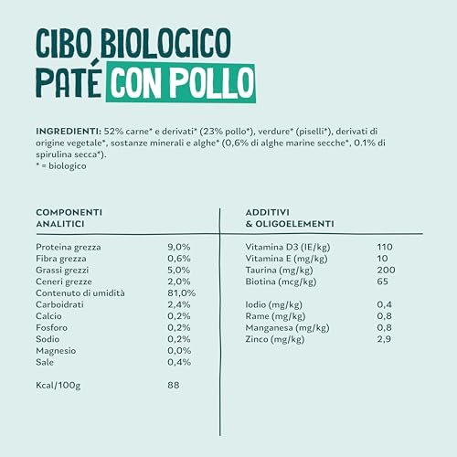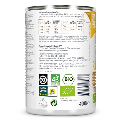 Yarrah’s Bio Katzenfutter Pate mit Huhn ist ein feuchtes Alleinfutter. Zusammensetzung: 52% Fleisch* und tierische Nebenprodukte* (Huhn* mind. 23 %), Getreide* (Weizen*, Mais*), Mineralstoffe, Algen* (0,6% von getrockneten Meeresalgen, 0,1% von getrockneter Spirulina*). *= aus kontrolliert biologischem Anbau. Analyse: Rohprotein: 10%, Rohfett: 4,5%, Rohfaser: 0,4%, Rohasche: 2%, Feuchtigkeit: 80%. Nährstoffzusatz/kg: Taurin: 190mg , Vitamin D3: 110IU/IU/IE, Vitamin E: 10mg. Fütterungsempfehlung: <2,5kg = 200g / 2,5-4kg = 400g.